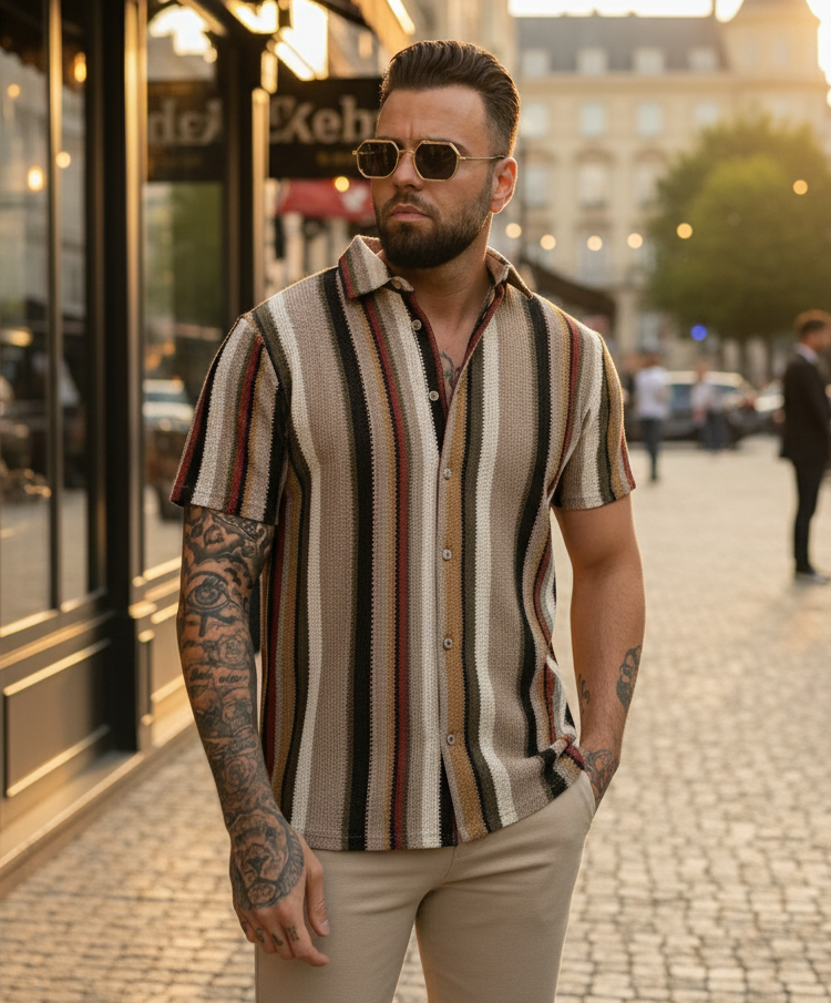 Featuring a button-down front, short sleeves, and a relaxed fit, this shirt is perfect for both casual and smart-casual looks. The beige–khaki green tone adds a unique, earthy contrast that pairs effortlessly with chinos, denim, or tailored shorts.